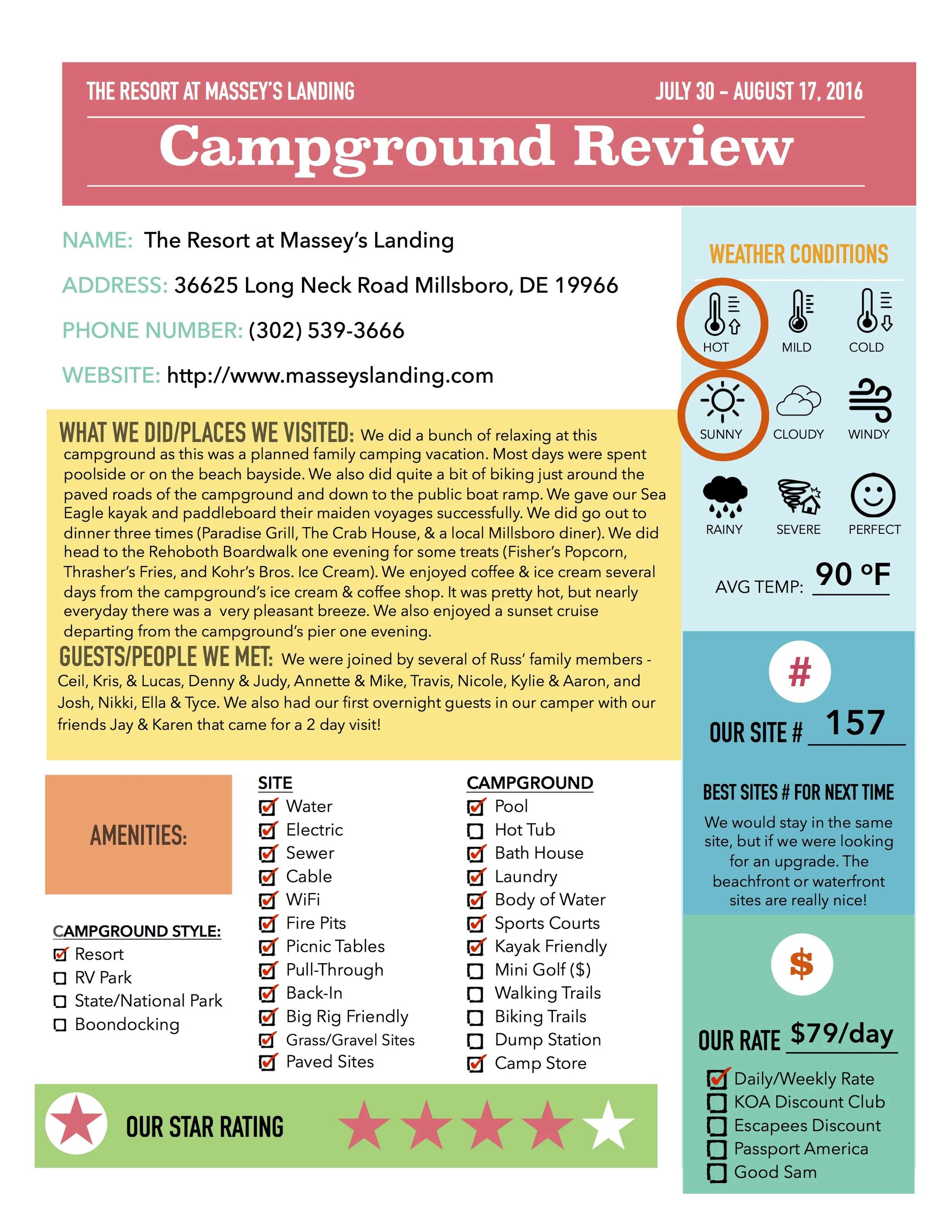 The Resort at Massey’s Landing had an activities schedule with daily activities for kids and adults alike. The paved roads make this a great campground to bike around. The campground was built around several small inlets/canals, making it a perfect place to kayak. We spent several mornings/afternoons paddling around the different canals throughout the campground. The original map showed a kayak launch which wasn’t built yet, but it would be great addition to see in years to come.