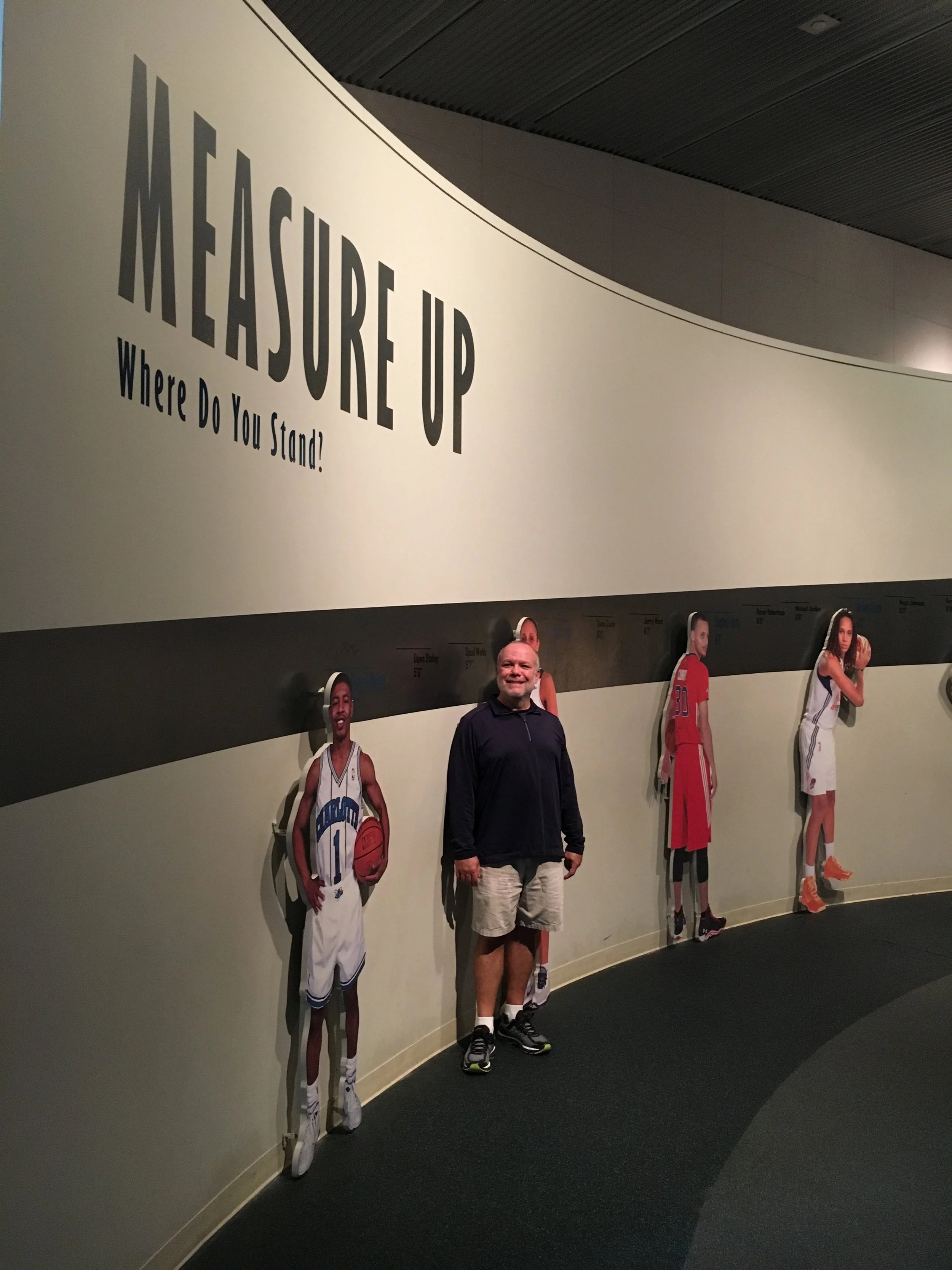We walked down some steps to the second level where the history of the game is on display. There are thousands of pieces of basketball history on display. Our employee friend, Gary, even brought Betsy one of LeBron James’ shoes on display at the Hall to hold and photograph. Besides the displays on this level, there are also some interactive games and displays to participate in. There was even a display where you could measure your vertical leap. So of course Betsy and I had to try it out. It brings things into perspective when you watch these spectacular athletes on television and they talk of 35, or even 40 inch vertical leaps. And then you record your own, jumping as high as you can, and it comes out to be a measly 15 inches. (Betsy’s was 14 inches!) So yes, we both have proven we have the skills to jump over a phone book. Maybe not the Manhattan phone book, but most phone books. Do they even print phone books any more? Another topic for another post.
