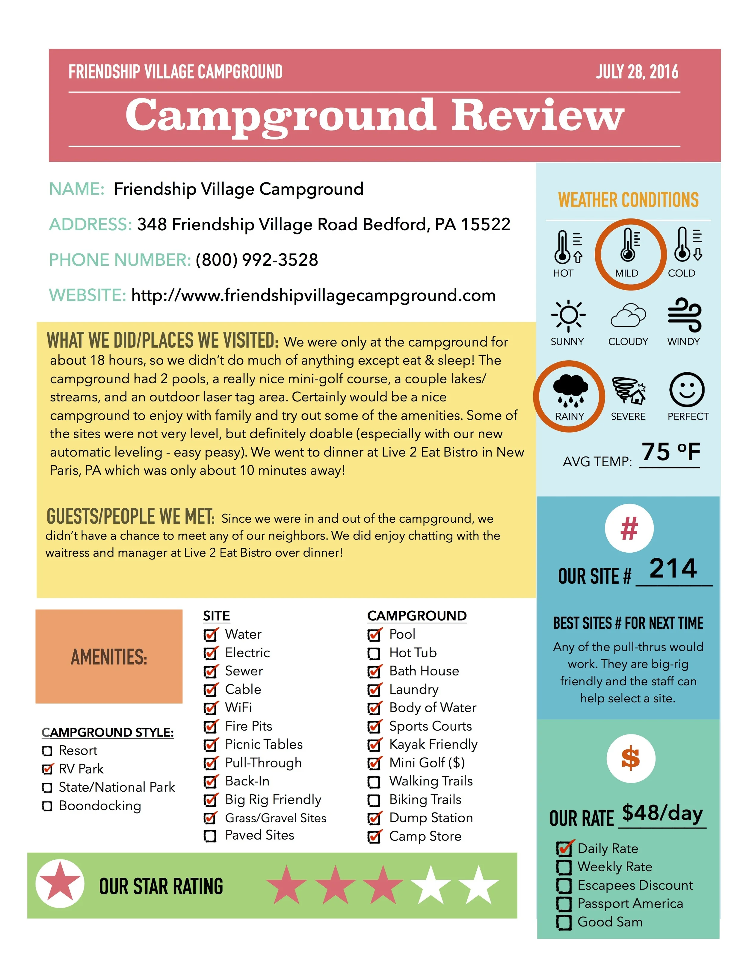 Another overnight stop so not much time to enjoy the amenities, but the Friendship Village Campground did have quite a few to mention. The campground was fairly spread out. We didn’t get a chance to walk the whole thing because it was raining almost the entire time we were there. However, just from driving around we passed two pools, two camp stores (with ice cream), nice mini golf course, outdoor laser tag area (fun, eh)! Some of the sites were fairly un-level most of them dropping off at the end of the site. However, it was certainly doable to get level. Some were better than others. Overall, the campground was big-rig friendly. There was also a 5 acre lake where you could do a little kayaking. They did rent kayaks onsite as well. We would most certainly consider returning to this campground if we were in the area. Very reasonable considering some of the amenities. Would be a good campground for those with kids as it seemed there was a lot of activities going on to keep the little ones occupied and happy!